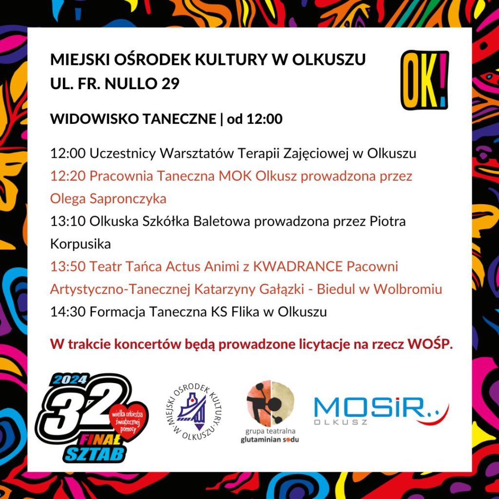 W olkuskim Domu Kultury już od godziny 12.00 rozpocznie się widowisko taneczne, podczas którego wystąpią: uczestnicy Warsztatów Terapii Zajęciowej w Olkuszu, Pracownia Taneczna MOK Olkusz, Olkuska Szkółka Baletowa, Teatr Tańca „Actus Animi” z Wolbromia, a także Formacja Taneczna KS Flika z Olkusza.