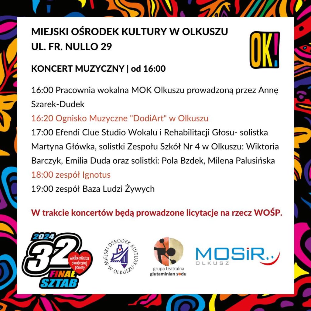 Z kolei o godz. 16.00 w sali widowiskowej MOK rozpocznie się koncert muzyczny. Przed olkuską publicznością wystąpią: Pracownia Wokalna MOK Olkusz, Ognisko Muzyczne “DodiArt” w Olkuszu, Efendi Clue Studio Wokalu i Rehabilitacji Głosu, a także solistki – uczennice olkuskich szkół. Finałem będzie koncert zespołów „Ignotus” oraz „Baza Ludzi Żywych”. W trakcie widowiska muzycznego oraz koncertu muzycznego będą prowadzone licytacje na rzecz WOŚP. Szczegółowy program na stronie MOK.