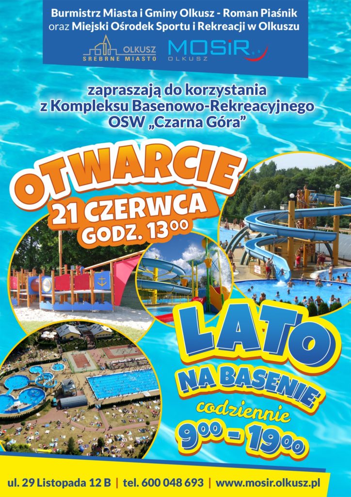 W dniu otwarcia, a więc w piątek 21 czerwca, Kompleks czynny będzie od godz. 13:00 do godz. 19:00. W kolejnych dniach wakacji, obiekt będzie dostępny dla wszystkich użytkowników siedem dni w tygodniu w godzinach 9:00 – 19:00. Serdecznie zapraszamy i życzymy niezapomnianych, wodnych wrażeń.