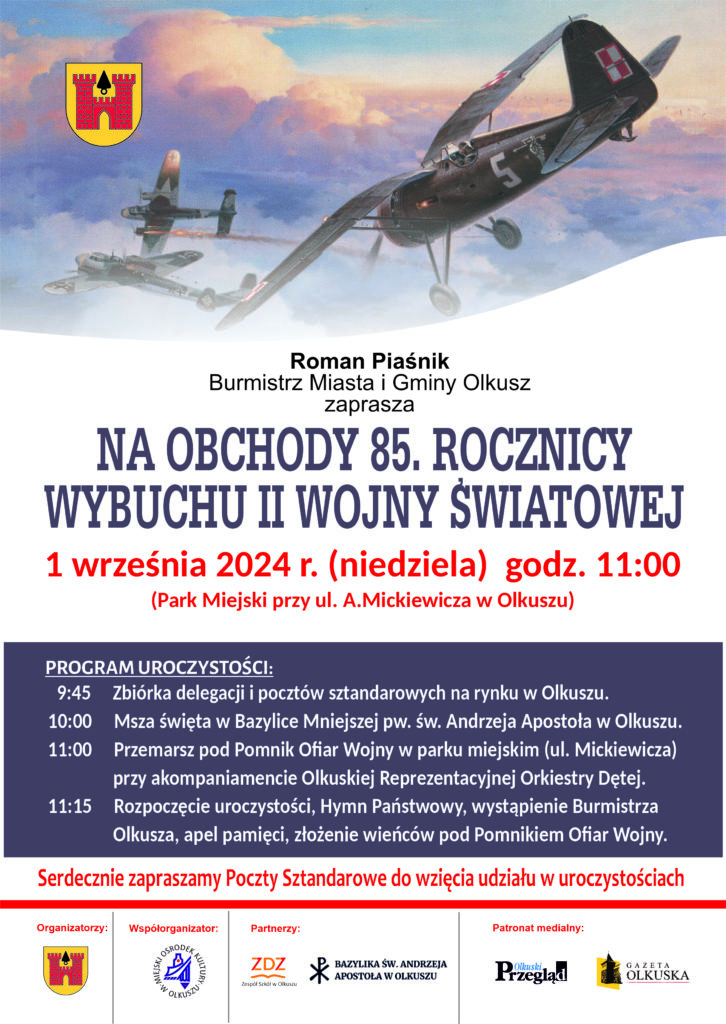 Uroczystości rozpoczną się o godzinie 9.45 zbiórką delegacji i pocztów sztandarowych na rynku w Olkuszu. O godzinie 10.00 w Bazylice Mniejszej pw. św. Andrzeja Apostoła w Olkuszu rozpocznie się Msza św. w intencji mieszkańców Olkusza i ziemi olkuskiej poległych podczas II wojny światowej. Po mszy, około godziny 11.00 uczestnicy uroczystości przejdą przy akompaniamencie Olkuskiej Reprezentacyjnej Orkiestry Dętej pod Pomnik Ofiar Wojny w Parku Miejskim przy ulicy Mickiewicza, gdzie odbędzie się główna część uroczystości. Po Hymnie Państwowym i wystąpieniu Burmistrza Olkusza rozpocznie się apel pamięci, który odczytają uczniowie klasy mundurowej olkuskiego ZDZ. Całość uroczystości zakończy złożenie wieńców pod Pomnikiem Ofiar Wojny przez przybyłe delegacje. Serdecznie zapraszamy Mieszkańców, a także Poczty Sztandarowe olkuskich szkół, instytucji i organizacji do wzięcia udziału w uroczystościach. Organizatorem uroczystych obchodów 85. rocznicy wybuchu II Wojny Światowej jest Roman Piaśnik Burmistrz Miasta i Gminy Olkusz, współorganizatorem Miejski Ośrodek Kultury w Olkuszu, a partnerami wydarzenia są Parafia pw. św. Andrzeja Apostoła w Olkuszu oraz Zespół Szkół w Olkuszu ZDZ w Katowicach. Patronat medialny: Przegląd Olkuski i Gazeta Olkuska.