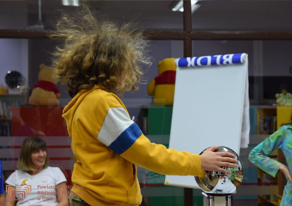Następnie młodzież (w wieku 11-13 lat) wraz z opiekunami wzięła udział w elektryzujących eksperymentach Laboratorium Pana Korka!  Uczestnicy warsztatów dowiedzieli się czym jest ładunek elektryczny, sprawdzili jak ładunki elektryczne oddziałują na siebie i w jaki sposób można naelektryzować rożne przedmioty. Poznali też różnicę między napięciem a prądem elektrycznym oraz sposób pomiaru tych wielkości. W miarę warsztatów napięcie rosło! Zdobytą wiedzę młodzi naukowcy wykorzystali m.in. do zorganizowania wyścigu puszek zdalnie sterowanych ładunkiem. Młodzież wraz z opiekunami zbudowała też ogniwa elektrochemiczne, wykorzystując łatwo dostępne przedmioty, a z najodważniejszych uczestników warsztatów stworzona została żywa bateria elektryczna!