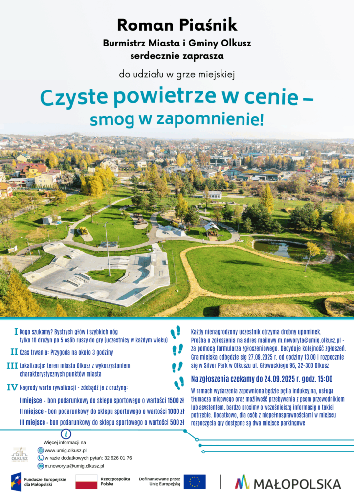 Roman Piaśnik Burmistrz Miasta i Gminy Olkusz serdecznie zaprasza do udziału w grze miejskiej „Czyste powietrze w cenie – smog w zapomnienie!”. Gra miejska odbędzie się 27.09.2025 r od godziny 13 00 i rozpocznie się w Silver Park w Olkuszu ul. Głowackiego 96, 32-300 Olkusz. Na zgłoszenia czekamy do 24.09.2025 r. do godz. 15:00.
