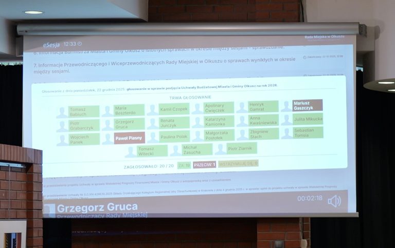 Budżet Miasta i Gminy Olkusz na 2026 rok został przyjęty przy udziale 20 radnych obecnych na sesji. Za uchwałą głosowało 19 radnych, 1 radny był przeciw.