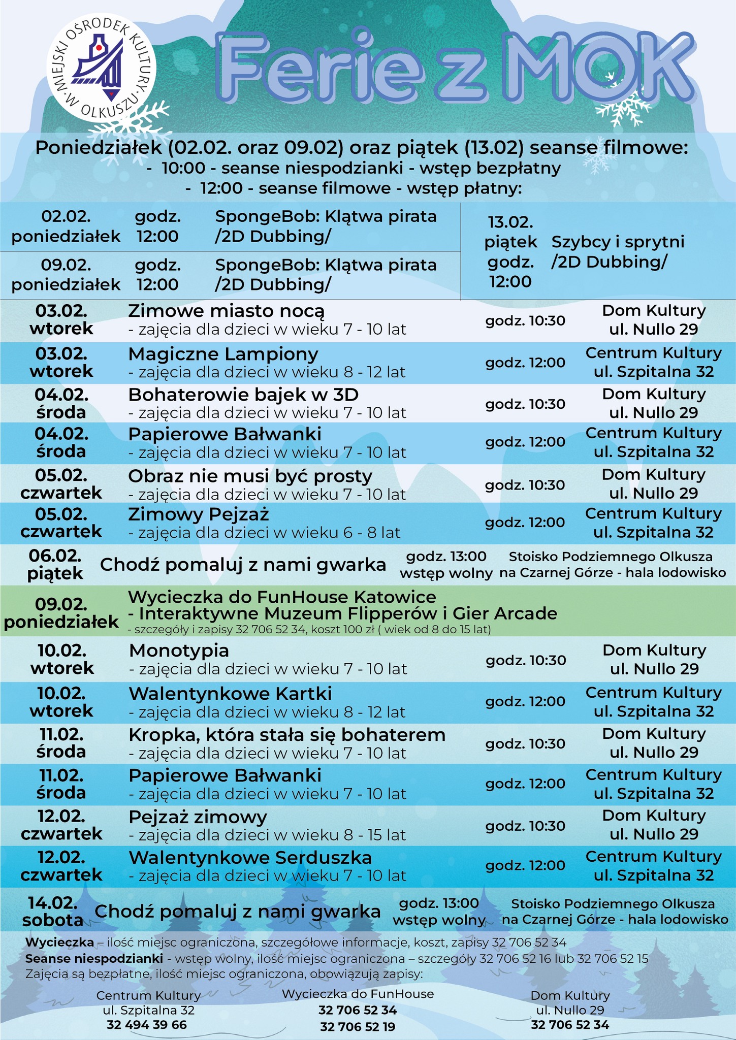 Atrakcyjną ofertę zajęć dla dzieci i młodzieży przygotował Miejski Ośrodek Kultury w Olkuszu. Dom Kultury zaprasza na zajęcia plastyczne oraz kreatywne, a także seanse kinowe dla dzieci. Ciekawe zajęcia będą się także odbywały w Centrum Kultury MOK (ul. Szpitalna 32). Z kolei w hali lodowiska na Czarnej Górze dzieci będą mogły wziąć udział w zajęciach „Chodź pomaluj z nami gwarka”. W planach jest także wycieczka do „FunHouse” w Katowicach, której atrakcją będzie Interaktywne Muzeum Flipperów i Gier Arcade. Szczegółowy program akcji „Ferie z MOK” można znaleźć na stronie MOK.