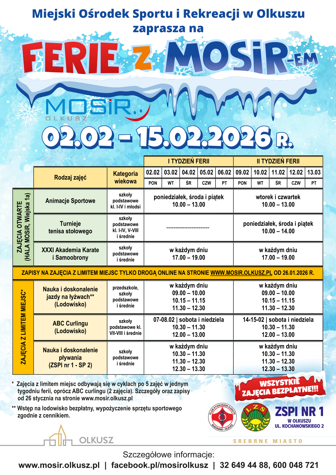 Pomysłem na aktywne spędzenie zimowych ferii jest bogata i różnorodna oferta zajęć, jaką przygotował Miejski Ośrodek Sportu i Rekreacji w Olkuszu. Na hali sportowej będą Animacje Sportowe, turnieje tenisa stołowego oraz zajęcia w ramach 31. Akademii Karate i Samoobrony. Z kolei na krytym lodowisku na Czarnej Górze będzie nauka i doskonalenie jazdy na łyżwach i ABC Curlingu. Na krytej pływalni na Osiedlu Młodych na chętnych czeka nauka i doskonalenie umiejętności pływania.