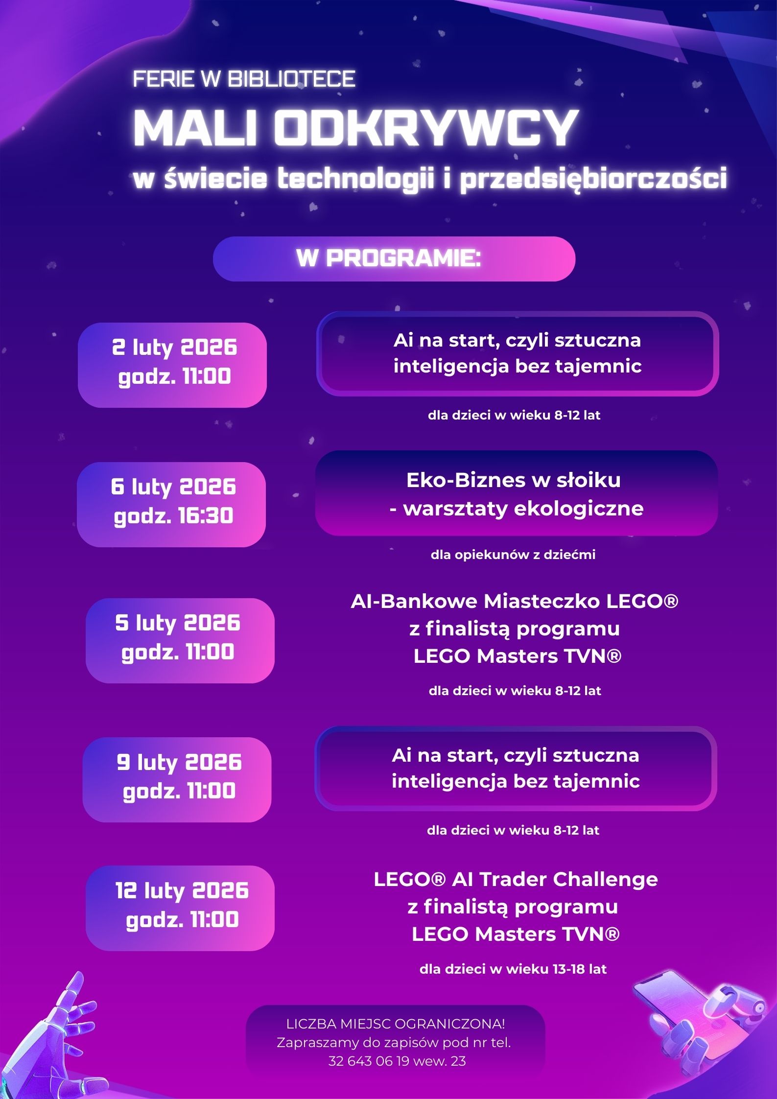 Różnorodną ofertę zajęć przygotowała także Powiatowa i Miejska Biblioteka Publiczna w Olkuszu w ramach akcji „Mali odkrywcy w świecie technologii i przedsiębiorczości”. Podczas ferii chętni będą mogli wziąć udział w ciekawych zajęciach wprowadzających dzieci w świat AI, warsztatach z finalistą programu LEGO Masters TVN Patrykiem Ziętarą oraz rodzinnych warsztatach ekologicznych, podczas których uczestnicy wykonają własny las w słoiku.