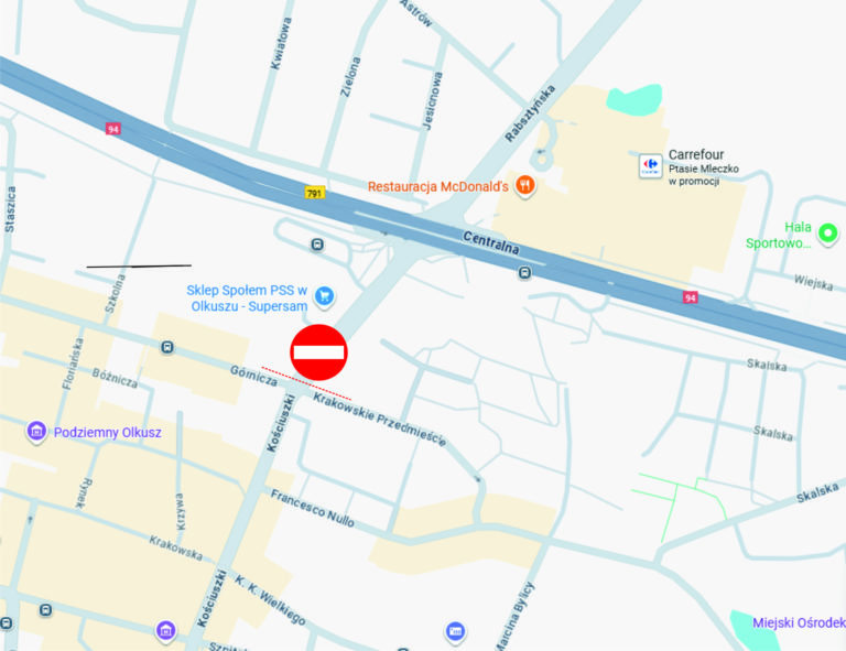 Wykonawca przebudowy Drogi Krajowej 94 na odcinku w Olkuszu informuje, że w związku z prowadzonymi pracami na DK94 od poniedziałku 18 sierpnia 2025 r. tymczasowo zamknięty zostanie odcinek ul. Kościuszki – od ul. Górniczej do drogi krajowej.